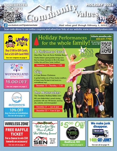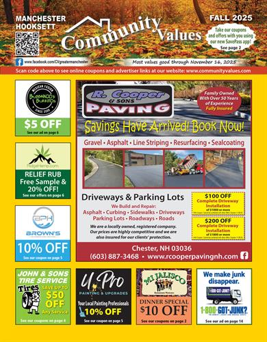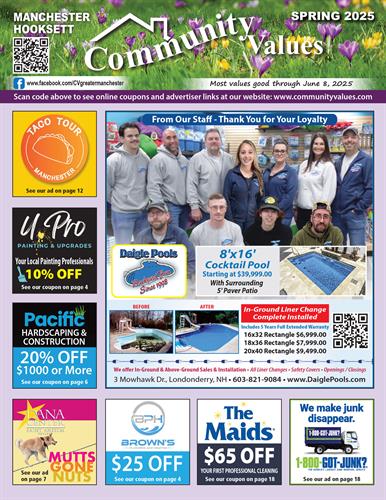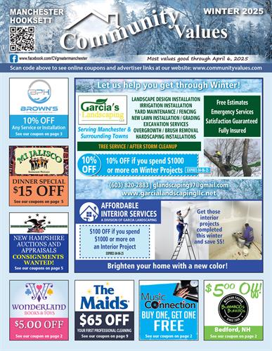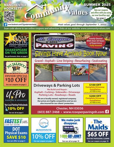 Community Values magazine is a glossy publication featuring local businesses and directly mailed to 70,000 homes in the greater Manchester area (including Manchester, Hooksett, Bedford, New Boston, Goffstown, Derry, Londonderry, Chester & Auburn), 226,000+ in Southern NH and a total of 700,000+ homes in all our markets across Eastern New England. We publish 5 issues a year, ad design is free, and we offer exclusivity for many industries. The per issue cost to hit 70,000 homes in Greater Manchester region for a 1/4-page ad is less than a penny! Ads are also posted on our website and Facebook page to highlight your business to the community.